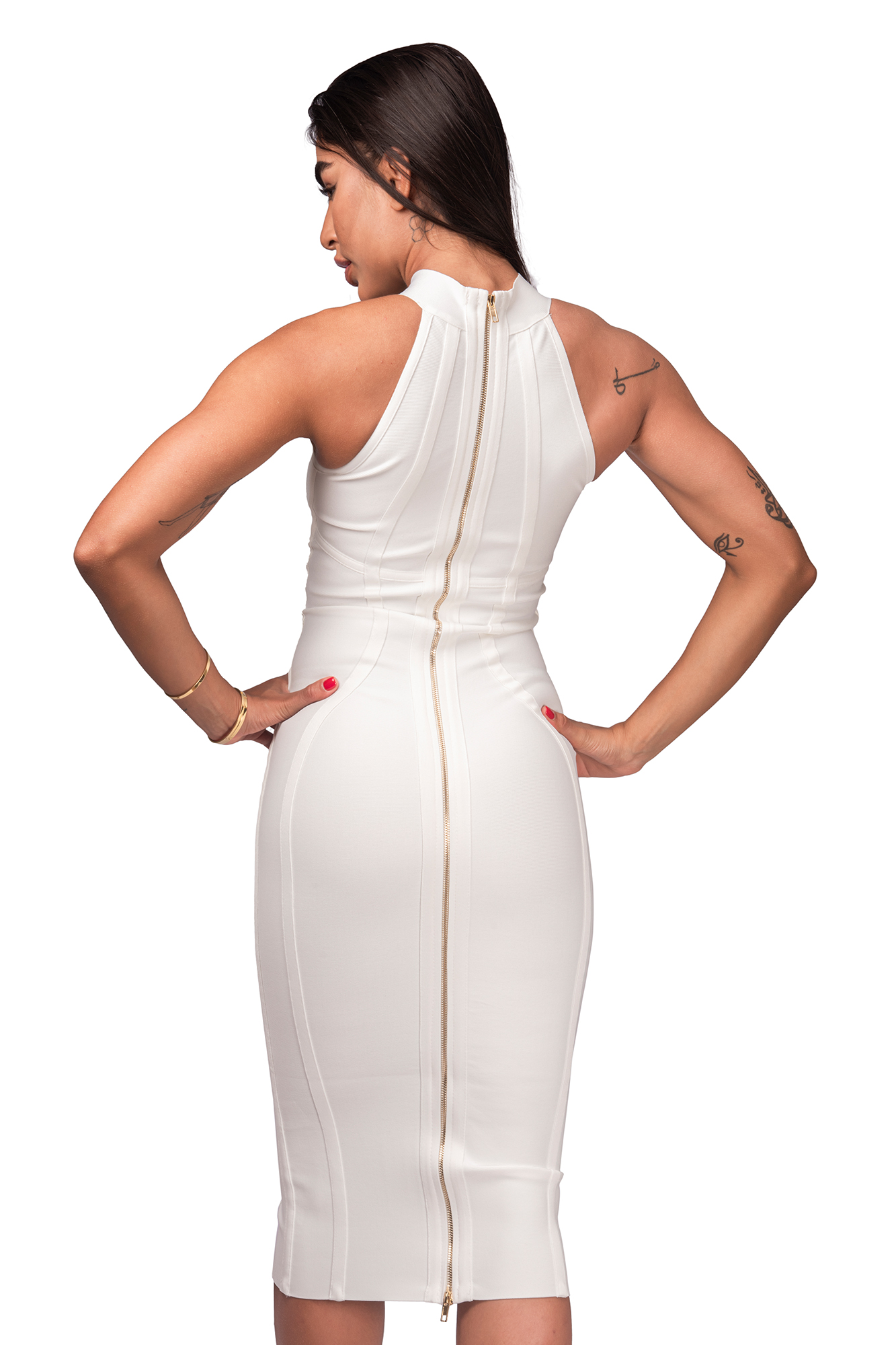 Stunning below the knee pencil dress made with thick and supportive breathable bandage fabric.