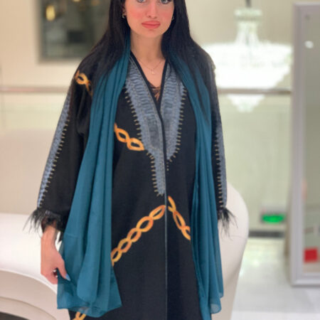 Hand Painted Abaya With Gold chain & Feathers On Sleeves