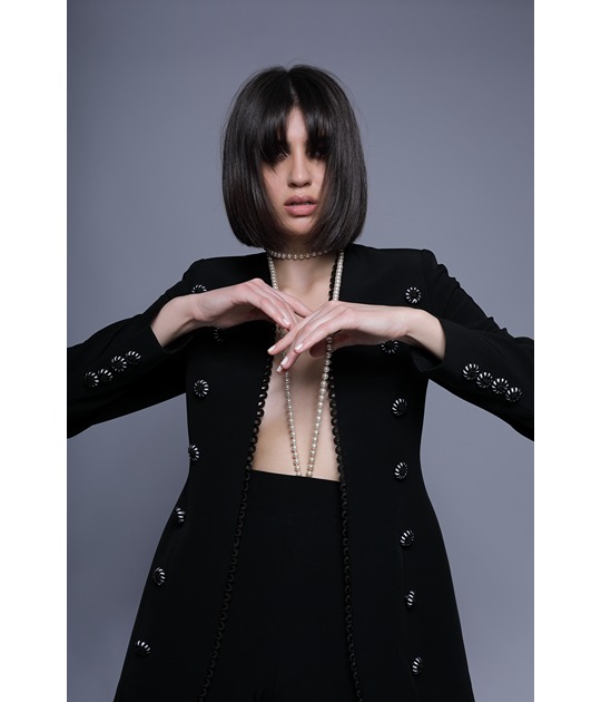 Black Suits with a crepe georgette fabric and handmade passementerie buttons.